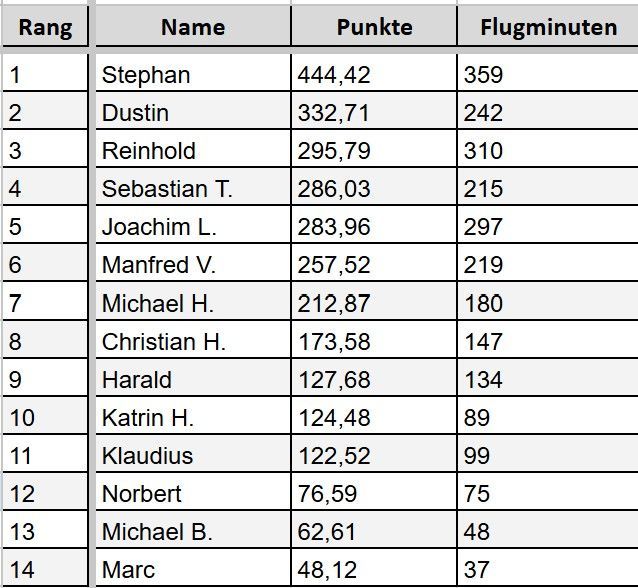 Ziel ist es, lange und weite Flüge unserer Mitglieder zu fördern. Durch die Komponente Flugzeit können sich auch Mitglieder vorne platzieren, ohne dafür große Strecken fliegen zu müssen. Der Spaß soll im Vordergrund stehen.
